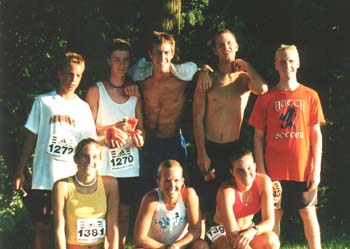 Welp, we all decided that we would / could run the Pemberville 5-miler on Friday, August 17, 2001. So we did. I knew the race would prove to be interesting, since I hadn't run in two weeks and Trevor hadn't run over a mile...in his life! So we got to the starting line, ready to go. The siren went off, and the race had begun. Knowing there were 539 people behind me, I knew there was a good chance I could have been trampled, so I took off like I sometimes do...in a sprint. So I was winning the Pemberville 5-miler for the first 200 meters. Pretty cool, eh? I thought so. The race went on like a long freakin' race, and I was tired after the first mile. It was a 5:41. Yikes, too slow for a good time, so I was doomed from the beginning.