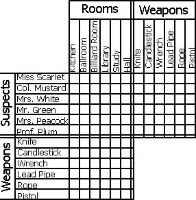 1) The six suspects are : Miss Scarlet(1), the one who used the Rope(2), the one in the Billiard Room(3), Col. Mustard(4), the one in the Kitchen(5), and the one who used the wrench(6).