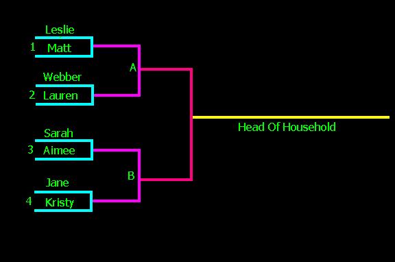 The pairings are as above. All were selected randomly. On each houseguest's list, whoever is ranked highest will receive a vote. Then the one with the most votes moves on to the next section of voting. DO NOT vote for each pairing individually. Whoever is at the top of the most lists will be the new Head of Household. Good Luck.