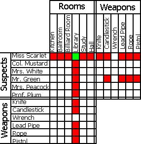 Miss Scarlet does not have the knife, so that means, since she is in the Library, that the Library cannot contain the knife. so where "Knife" and "Library" intersect, we make an red dot. Then, all of the weapons that Library cannot have, can also not be had by Miss Scarlet.