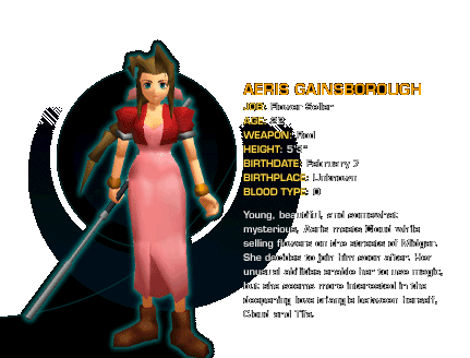 I've never really liked Aeris all that much, but I respect those who do like her. She's just never been very appealing to me, and I don't really like the way her character behaves, but enough about that.