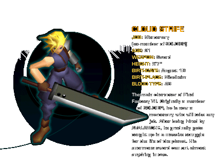 Ah yes, the Cloud man himself, spiky boy-wonder, who walks lightly and carries a big sword, so watch out. Being my favorite character, I guess I have a bit of a biased opinion of him, but... he's so fricking cool!