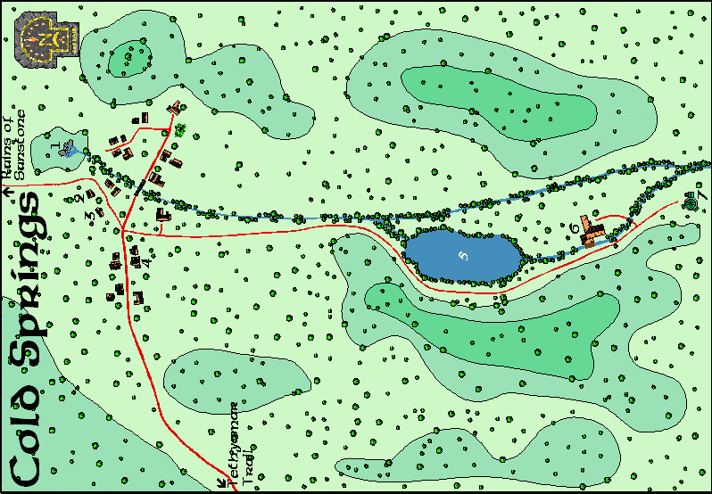 Cold Springs is just below the hill where the Cold Rush Creek has its source. The village lies in a slight depression within a lightly forested landscape of very low, gently rolling hills. The road that leads into Cold Springs from the Tethyamar Trail dead ends in every direction but the north, where the old road becomes overgrown and soon dwindles into a little used but still visible trail to the ruins of Sunstone, once a village a few miles/kilometers to the north.
