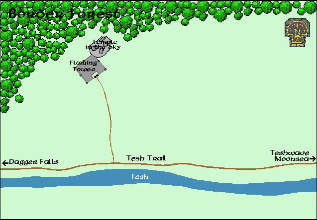 The Flaming Tower is on the Tesh about a day's ride downstream from Dagger Falls. It's a large tower that the Zhentarim recently rebuilt, after its destruction two decades ago by the Knights of Myth Drannor. Chained to it is a big chunk of rock that floats up in the sky, called the Temple in the Sky, a product of old Netherese magic. Before the Time of Troubles, the voice of Bane used to speak from the temple.