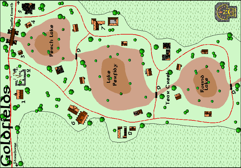 During the latter years of the Zhent occupation, some of the abandoned cottages and farmhouses served as shelter for Zhentish soldiers and for orcs and other monsters in the service of the Zhentarim. A dozen fishing cottages - some of them in ruin - still stand on the shores of the small dry lakes, really little more than large ponds, that an earlier generation of Goldfields residents created with a trio of bridge dams on Tear Creek. The bridge dams all are intact, although the gears to open the dam gates are permanently rusted into their last position. There are 20 farms spread across the relatively flat Tear Creek Valley east and west of the village, most still intact, although some are ruins. Only four of these farms, one a ruin, are shown on the village map.