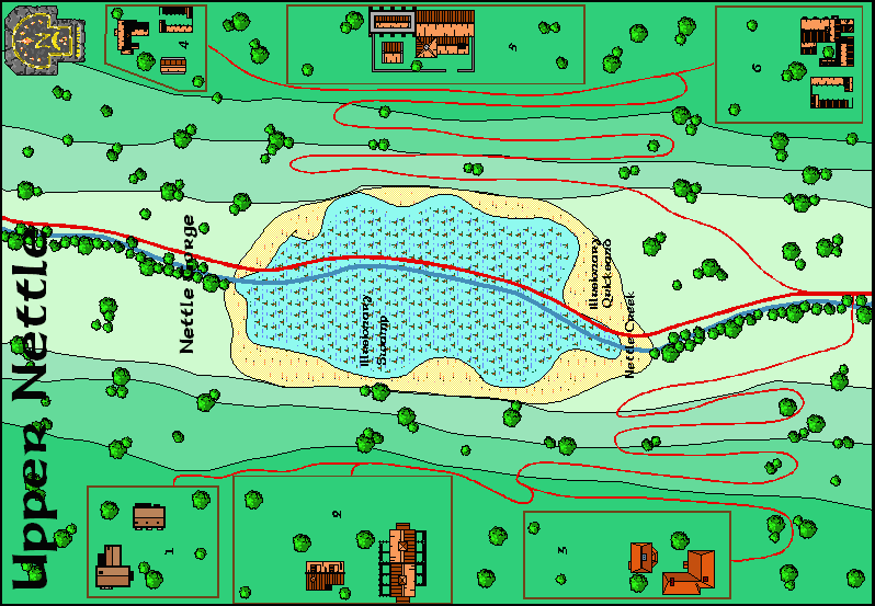 6 - Kilby Werret's Ranch. Breeder of beef cattle and draught horses. Werret (hm lvl 0, AL: LN) has lived all of his life in Upper Nettle. He well may have some thoughts on the manner in which Nettle Creek suddenly backed up and produced a swamp, but if so, he keeps his opinions on this issue, like all of his other opinions, to himself.