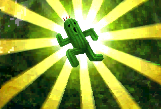 In Battle:Cactuar jumps into the air and begins to shine, it then throws thousands of needles at your enemies. Its strength depends on its level (Lv 50=5,000 damage, Lv 80=8,000 damage, etc.) (non-elemental)