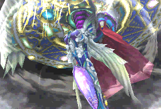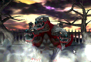 In Battle:In a dark and dreary place, big black gates open and out runs Cerberus. It opens its mouth and light shines as three rays fly out and hit your party. Then Double and Triple are cast on you. (non-elemental + Double and Triple cast on all party members)