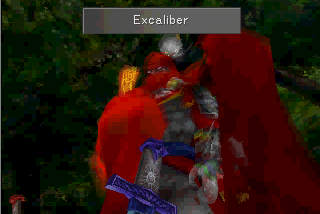 In Battle:Gilgamesh appears and sellects one of the three swords surrounding him. The Exaliper sword does nothing, the Excaliber sword damages all enemies, wil the Zantetsuken sword instantly kills all enemies.