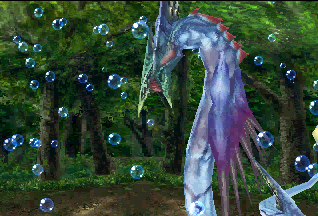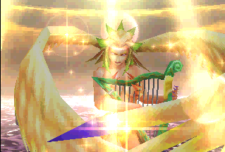 In Battle:A small wave crashes down on the enemies and then the screen is filled with water. In the middle on a rock is a beatiful winged woman. Siren's wings float elengantly in the air as she plays a song on her harp that damages all enemies and may silence them. (non-elemental + Silence)