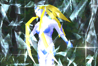 In Battle:Shiva hasn't changed much (except her looks) since she was in FFVII. She is still the goddess of ice and her power is imense. Shiva is shown asleep in an ice barrier, but then her eyes quickly open and she explodes from inside the barrier. Then with a wave of her hands she covers the enemies in ice (cool!). While Shiva isn't the strongest GF, she can kill off weaker enemies with ease. (Ice-elemental)