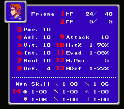 14: Weapon Skill- The first number is the maximum amount of hits that a weapon can inflict, the second is the amount of experience that the weapon currently has. (Once it gets to 100 it goes up a level.) Each level it goes up a character can do one more hit per attack. This is the same for all of the skills except the shield. If a shield is equipped, the shield will go up at the same rate as the weapon.