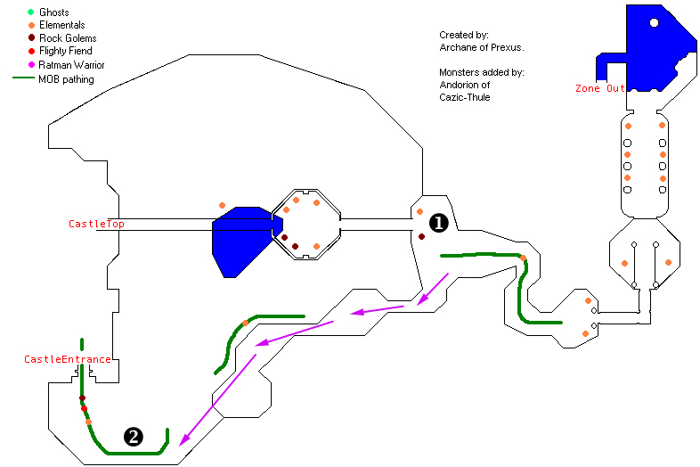 Where you see the wandering fiends, golems and elementals at "2" is where you should set up for your first small fights. You'll clear out some of the stuff in this area including golems, fiends (look like imps), and elementals. Just inside the area marked "Castle Entrance" is a pair of elementals that you can't see unless you walk into the room. They're halfway merged with the wall on either side of the door so give them a smack and bring them out to kill. Leave the group where they are and let the puller clear out some other things in this area to be safe. Don't go too deep either which way or you'll get stuff respawning outside and have to redo everything in the area.