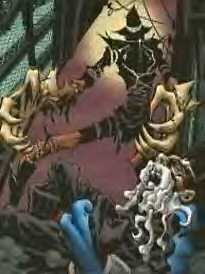 He awoke sometime later much to his surprise. He was badly burned and aching all over. He saw his house burned and saw his wife lieing dead before him. He kneeled beside her and wept. He vowed vengeance on Solomon for what he had done. He grabbed the only clothing he could find....the garb of the scarecrow. After donning the clothing and mask he set out to bury his wife.