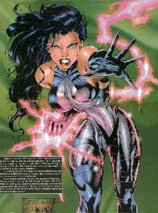 Cyblade, like the rest of Cyberforce, is a cybernetically enhanced mutant. Her particlar mutant ability is to psionically trigger "blades" of electromagnetic energy and aim it at someone. Her powers manifested themselves when Cyberdata tried to engineer her kidnapping when she was a little girl. (Why Cyberdata wanted to capture her is unclear; apparently they knew that she was a rather powerful mutant, only problem was, even she didn't know, so how Cyberdata found out is anybody's guess.) She was then trained by "Jocelyn," who taught her combat training and how to throw sharp things at people. Then her brother and father died, and Jocelyn became Dominque's guardian. They travel around the world for a while, carrying out missions for Cyberdata (although Dominique thinks that they're actually being some sort of hero/vigilantes) before Dominique enters medical school. She stays there for about two years -- and, apparently, she's some sort of biology whiz -- before she's tricked into working for Cyberdata and takes the name of Cyblade, and implanted with a "brain box."