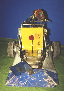 The "split personality" of this robot is Gary Gizzmo, the mad racecar driver, has been entered into Battlebots; mid-weight class (115lbs). Gary won his first fight, but was hit hard in the beginning of the second by Pack Rapter. the CO2 bottle that pressurises his arms was spun around and the tubes were pinched. We weren't taken out, but the Rapter collected more points than us, so Gary Gizzmo was eliminated.