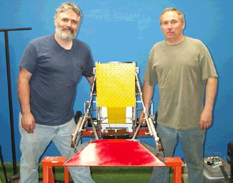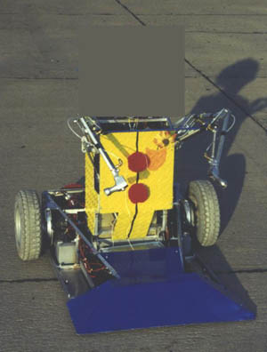 The "split personality" of this robot is Gary Gizzmo, the mad racecar driver, has been entered into Battlebots; mid-weight class (115lbs). Gary won his first fight, but was hit hard in the beginning of the second by Pack Rapter. the CO2 bottle that pressurises his arms was spun around and the tubes were pinched. We weren't taken out, but the Rapter collected more points than us, so Gary Gizzmo was eliminated.