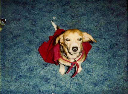 Another early year portrait of DJ in her puppy years. We dressed her up on Halloween with a red cape from my early childhood. It looked so adorable.