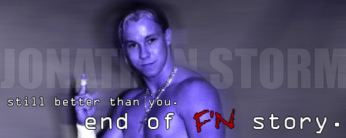 I stayed up all night, lying in bed. I just listened to Helena's breath. That's all I did...just think. I didn't want to disturb her...she seemed so serene. I got to thinking. What made me so content with just..."getting by"? Why was I, Jonathan Daniel Collins, willing to settle for less? Think about it with me...c'mon, it'll be fun. In less than a year, I won the Canadian Title, King of Violence, the World Title, and I beat Big Nose three times. That's a whole lot of accomplishments for a guy who had to compete against Big Nose, Michael Trey, Gavin Coens, Tempest, Chris Davison, J. Simon Rykopathe, and a laundry list of stars. My name was up in lights...I was at top billing. So why was I willing to play the co-star? It almost seems apropos that the line on my visual reads "Sick of Myself...". After all, I'm exactly that. Sick of myself. Sick of letting myself slide by, because I think I can. It's thoughts like that, that ruin you. Have I been ruined? Quite possibly. I've settled into this little rut known as the North American Title. Such illustrious names as Inferna, Jon Fuller, and Greg Bowman have held it! Anyone noticing a trend? This is the equivalent of giving Sean "Puffy" Combs a suit bought at Sears to wear. I guess it's just the common physics of stardom. What goes up...right? Can you imagine how loud Lance Sterling is laughing? Here's the guy who ripped him a new asshole, and now I'm next to nothing. He must be so proud to know he lost to a jobber. Tempest must be pleased to know she lost her title to a curtain jerker. So now I sit, wait...one more punchline for the gods of Olympus to tell. There wasn't a big boom. There was no triumphant requiem for the career of the "Next Big Thing". I bet you can't remember the night I won the North American Title. I bet you don't remember what I've done since then, either. The most unforgettable face in the HWF in 2001, has become 2002's "Where Are They Now?" star. So what the hell happened? Who am I? People spent their fifty dollars to come to the arena to hurl garbage at me. They'd chant "Backdoor Boy" at me. Then they paid money to adore and worship me. I was their diety, and I had them chomping at the bit. I was everything they wanted to be. Now I am nothing to them. I am an afterthought. I am Jonathan's sense of forgetfulness. And you wonder why I'm always in a bad mood. At this point in time last night, Helena rolled over and reached out to hold me. She curled up against me, and whispered "Mmm...Jonathan..." before drifting back off into REM sleep. REM sleep. Remember that? Wonderland. That had you all on the edge of your seats, waiting to see what would happen, and who would be in my little world. My world is my hell. Welcome to it...won't you stay for a cup of tea? A brief chat? A chance to reminisce? So she curled up and burrowed her head into my shoulder. I think that was a moment of clarity for me. Maybe this might be what I've needed. Maybe being bound by this chain of a title could be what I need to make things work in my little world. It's that whole idea that I heard in a movie once. I remember the night we had Josh, Michael, Darrin, Gavin, Shawn, and myself over. We ordered a bunch of pizzas, a couple of kegs, and this stuck out in my mind. "It's only after you've lost everything, that you're free to do anything." I went around like a madman trying to find the actual book by Chuck Palahniuk. Michael got sick of me going to every Borders in every town and gave it to me. I read it like a bible. That's what kept me in motion. Reading it, taking some of the words into heart...and I was a new man. After all..."if I could wake up in a different place, at a different time, could I wake up as a different person?" Worked for me. What I've done to burn down my ivory tower will never be taken back. The memories will remain as its ashes, and I'll have to remember. It's my punishment. So I won't regret. I won't look at this as failure. I'll make lemonade from these lemons, by golly...and it's going to be good lemonade! Would you expect anything less from me? Welcome to my hell...rent's $650 a month. Utilities are extra, but you get a great view of the towering inferno of my career! But then there's that promise. When I looked downwards and saw her still curled up against me, a serene smile coming across her lips (or maybe it was just the light reflecting, I'll never know)...I remembered that I wouldn't let her down. I swore to it. It comes with that whole wedding vow shit. I am Jonathan renewed sense of spirit. And I am still falling. So I finally decided to get to sleep. I figured I finally could. I've managed to convince myself that what I'm in store for isn't so bad. I figured that I've earned what's coming to me right now, and I'll have to earn all that good stuff all over again. I have to put on a smile. I have to march out there this weekend against Norris Scott and accept my destiny. I'm going to make the most of it...but is this really what I want? This is a double edged dagger. Win, and I keep myself bound in this madness. Lose, and I fall farther. I look at her again, and I think she finally realizes I'm not asleep. She looks up at me. "Sweetie...you need your sleep." "Nah, Hel...I'm just thinking. You relax...I swear I'll be fine." "Okay, baby...*kisses his cheek*...just don't stay up all night. I want to go down to the beach tomorrow." "Of course, Helena...anything for you." Wow...I certainly like saying that these days, don't I? "Of course Mac...I'll take a dive for that no talent chump, Davison." How about "Of course William...I'll flounder around until you think it's my time again." How about I tell you when it's my time? How about I tell you to fall down? I'll do it one more time for you...and then... ...it's my time... Because quite frankly...I'm sick of myself...but even more sick of all of you.