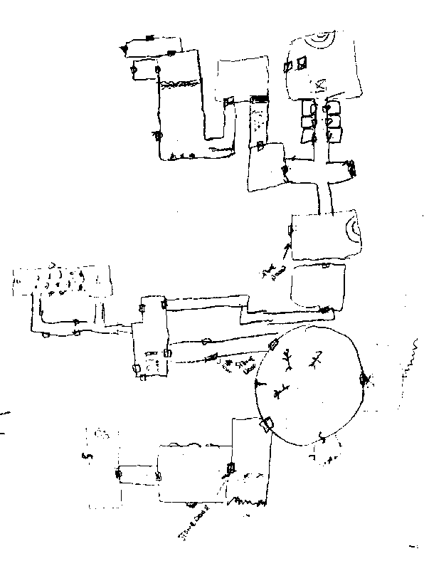 After the music had ended and Belfin regained his senses they entered the room again keeping close to the northern wall until the reached the door at the far end. This was another stone door, but was unlocked. They pushed it open into a short corridor that lead to another stone doorway. As the party walked down the corridor they all managed to activate a trap that fired arrows at them with every step they took. Roth, the barbarian, managed to take a critical hit from one of the arrows that dropped him unconscious. Belfin used his potion of cure light wounds to bring Roth back around. The door at the end of the corridor lead to hall that was filled with dust like a layer of gray snow. In the northern end of the chamber was a sculpture of a dragon carved from gold-veined black marble. Moss was the one who finally entered the room to look around. As he approached the 10' tall statue of a coiled dragon a Magic Mouth spell appeared on the dragon's jaws and spoke the following riddle: