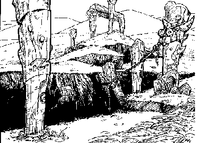 Looking into the dusty chamber they saw five dust covered sarcophagi against the wall of this obvious sanctuary. Each of the stone sarcophagi was carved in the likeness of Dark Elves bearing noble visages and wearing ceremonial robes. At the back of the room was a obsidian altar in the center of the west wall with a single candle burning. The entire altar was carved with dragons. On the altar, in addition to the candle they could make out two other items, a small glass whistle and a potion flask.