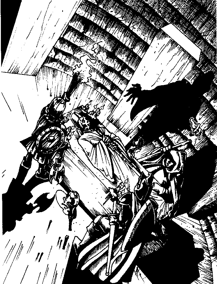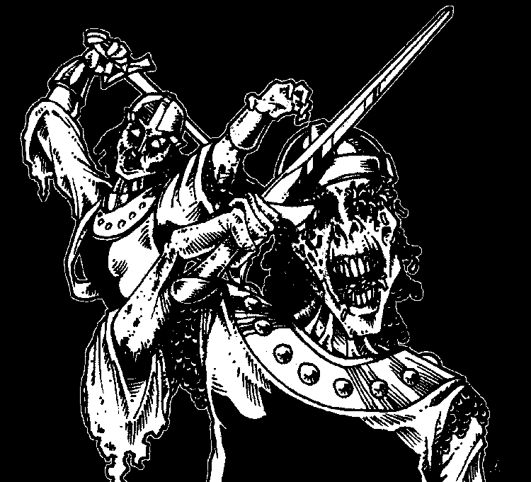 Deciding that they had to go down into the room eventually, the party prepared. Rhino cast a bless on them and Ulfgar and Rhino both cast magic weapon on both Cebo's axe and Rhino's mace. Thus prepared they cast a light spell on the coffin and lowered themselves down. As soon as they hit the floor a magical darkness cancelled their light spell. At the same time Rhino was attacked by something with a chilling touch and felt his strength drain out of him. Ulfgar quickly cast another light spell and the ones in the crypt could make out, just barely, a shadowy figure that attacked them again.