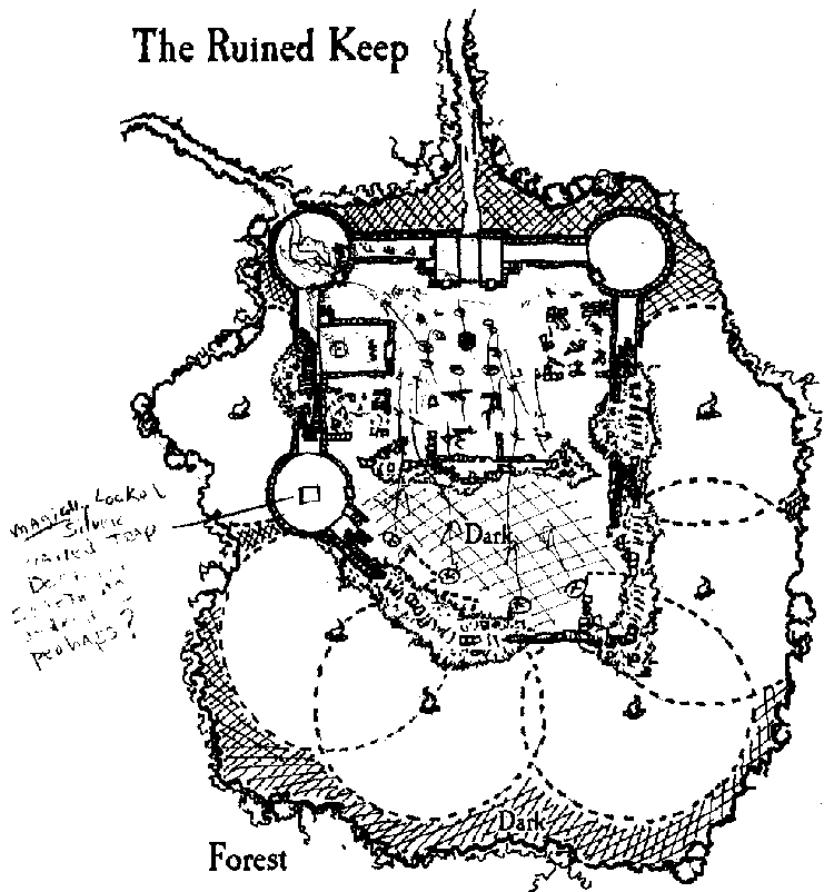 So the party followed the old main path towards the keep. Soon the road they were following started to become overgrown with trees, forcing them to travel single-file, then having to walk their horses. They finally arrived at the gatehouse of the ruined keep. The party stayed in the cover of the woods while Eldon scouted the gatehouse. The gatehouse looked mostly intact with the exception of the rusted portcullises looking rusted shut. Eldon then scouted around the perimeter of the fortress, keeping to the trees. He reported back to the rest of the group, giving them a rough map of the keep and what orcs he saw. Dweezil, Ulfgar's weasel familiar, also went into the keep and scouted out numbers and positions. What was spotted was over a dozen orcs and a single large ogre in the inner courtyard drinking out of open kegs.