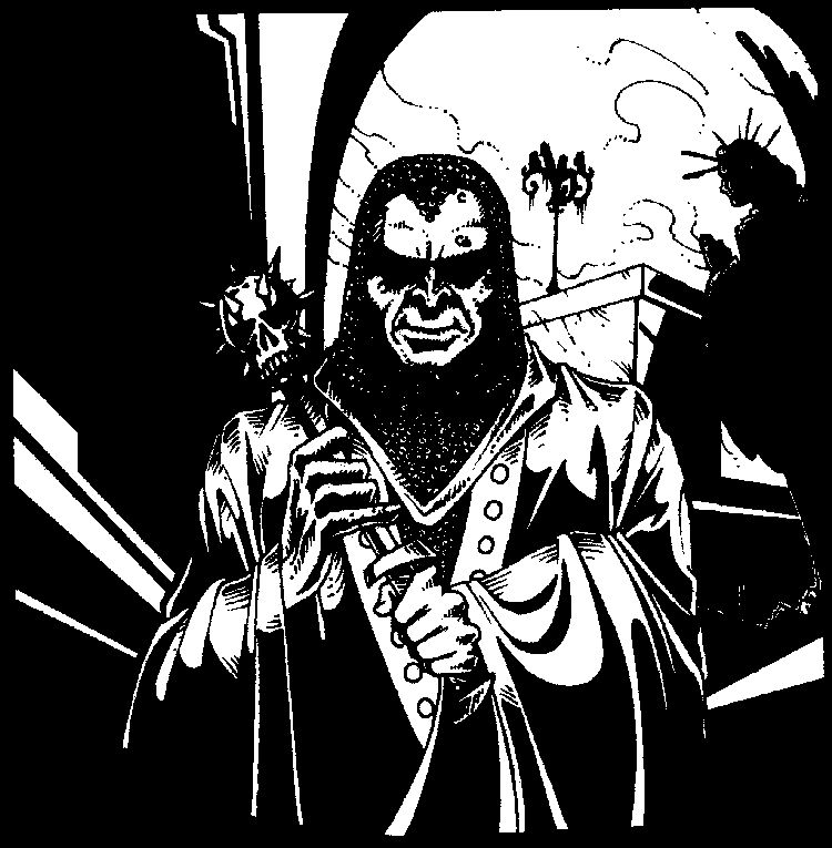 Cebo, using the scorpion took a shot at the hulking orc and managed to seriously wound him, the rest concentrated on taking him down with arrows. Moss managed to score a hit on the evil-looking half-orc. The evil half-orc, who was obviously a cleric (as evidenced by the evil black mace with the skull-topped spikes, and bearing the device of Orcus on his shield) tried to cast a spell on the group on the north wall, a spell that obviously failed. The evil priest then hunkered down behind his shield, giving the attackers time to take out a few more orcs. The evil priest then tried another spell, targeting Lauriel, which failed. (Flairian was able to determine that it was a hold person spell). The evil priest then gathered a group of orcs at rushed towards the northeast tower. Cebo, itching to get into hand-to-hand combat, quickly climbed down the bell tower and was joined by Moss as the headed to the tower. Flairian and Eldon quickly spiked the door to the wall shut.