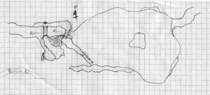 Deciding they need ropes to cross this bridge, Moss drank a potion of spider climb and re-crossing the first bridge, climbed along the wall until he reached the other side. There they tied off ropes and while roped themselves slowly crossed the now ruined bridge. In the darkness they could see where the ledge ended and a series of stepping stones allowed crossing to another ledge further on. The cavern the lake was in was so large that they could not see either the other side or the ceiling. The party arrayed themselves with sword, axe and shield and started walking along the shoreline in the light of Cebo's everburning torch.