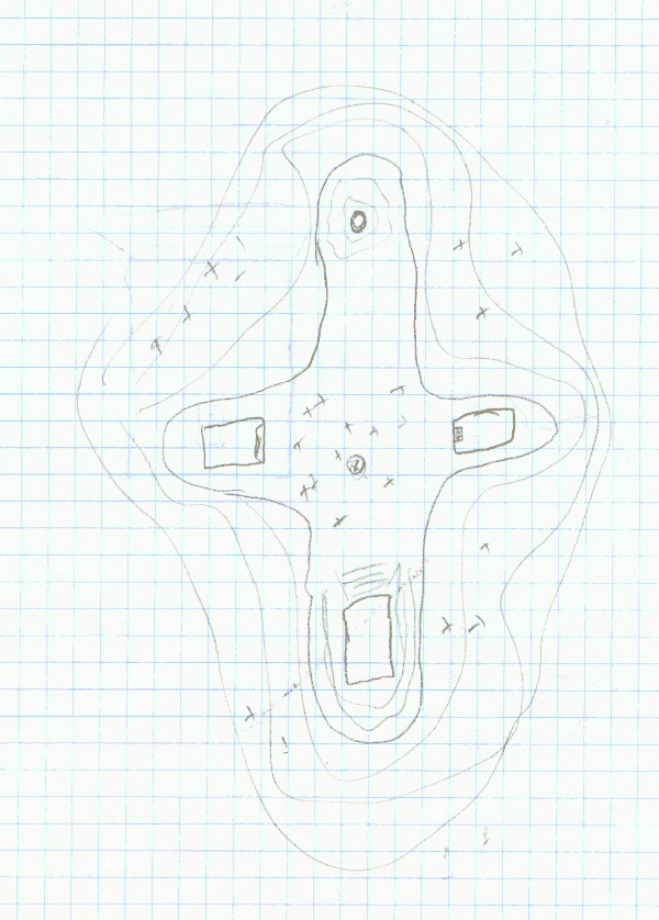 After a restless night they awoke to dim twilight as the sun rose above the Mistwall. The followed their map onward to the Dungeon of Graves. As they came over a hill they could see a great depression in the form of a cross before them. Rather than towering above ground, the graves have settled into depressions, and the main mausoleum, a building of strange green stone, rested in the deepest depression, some 40 feet below the ground. The cross shaped depression was dotted with old grave markers, including two other, smaller, mausoleums of green stone. Opposite the largest mausoleum they could see what appeared to be a large stone well. There were no gravestones near the well.