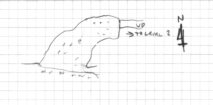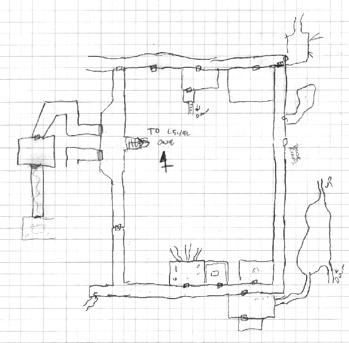 Opening the door at the end of the corridor they found another corridor running westward. By this time they think they have figured out that these corridors form a large square. They saw a door at the eastern end of the corridor that they checked out first. This door led to a room of hard-packed dirt and had several rat-sized tunnels branching off of it. To the north of the room was a much larger passageway. As the party looked in the room, clumps of dirt fell from the ceiling. Deciding the room was unstable, they abandoned any further exploration of the room.