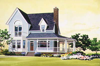A stone path cuts through the verdant lawn, leading up to the porch. The porch itself is very open, wrapping around over half of the house, giving those who dwell here a place to relax. In front of the porch, and the house are small decrotive trees, and carefully planted gardens.