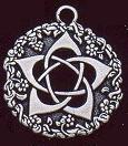 A Goddess Pentacle medallion of fine silver; A simple silver broken mirror pendant on a simple chain; a small engraves silver bell, on a silver chain, that chimes softly as she moves; and on a chain of pure platinum, are the symbols of the Gangrel and Malkavian Clans, intertwined in harmony. It is made of Hematite, with a small fire opal set into the eye for the Gangrel wolf.