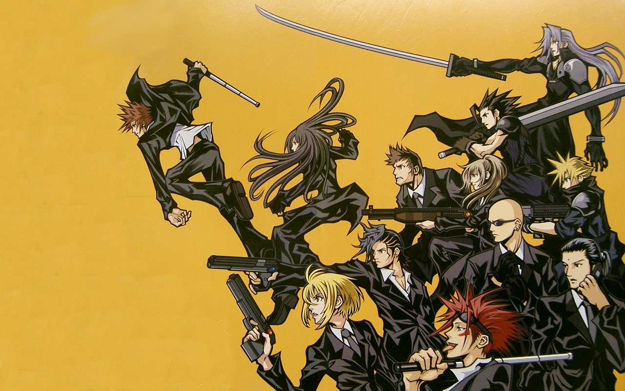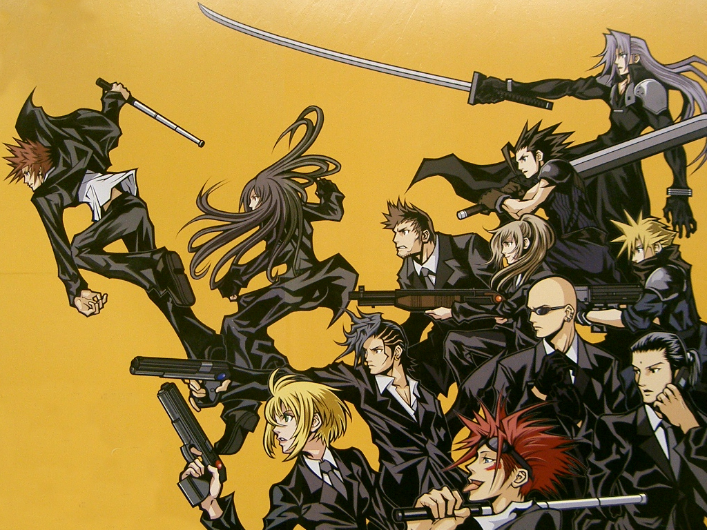 Characters: The Turks & SOLDIER Series: Final Fantasy VII(7) Comments: The image comes from the billboard for the new mobile phone prequel of Final Fantasy 7, "Final Fantasy VII: Before Crisis". Check out Zack with short hair and Cloud with even shorter hair. I'm also happy to say this is the first really detailed, clear Zack official art in a long time, perhaps ever. |
