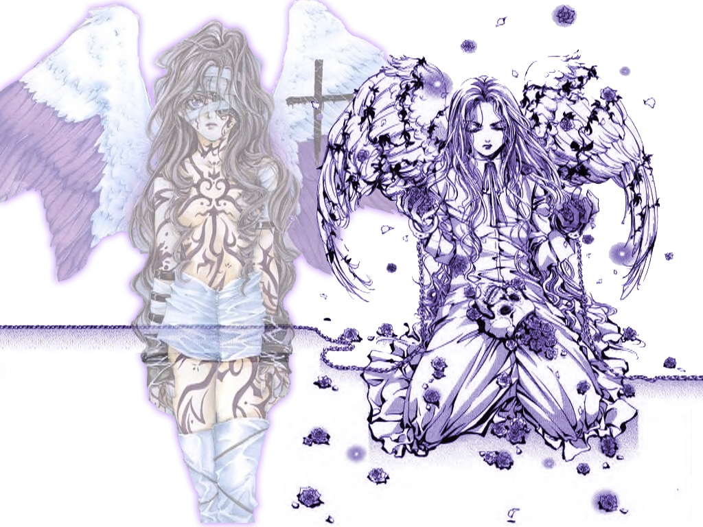 Characters: Alexiel & Rosiel Series: Angel Sanctuary Comments: A lot of purple in this one. I love the skull on Rosiel's lap and the bindings on Alexiel...very awesome images. |