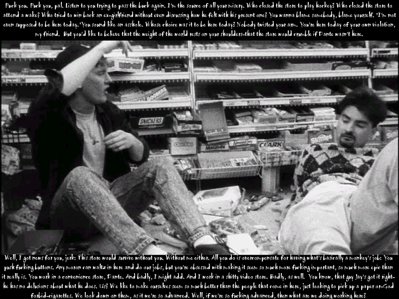 Characters: Randall, Dante Series: Clerks the Movie Comments: BlueKnux gets credit for this idea...all I did was screencap it and put on the text, lol. This is Randall's famous rant at Dante for being an ass hole. Best Randall moment IMHO. Had to be made for a small resolution as the screencap itself was small and I didn't want to resize it too much. |