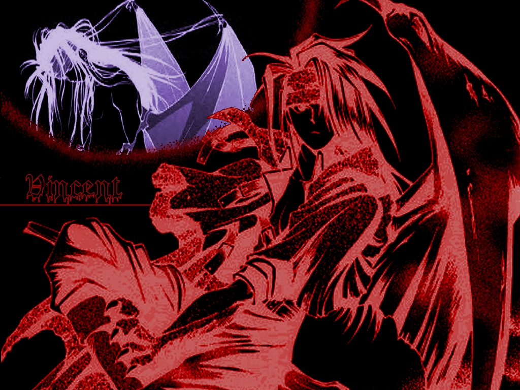 Characters: Vincent Valentine Game: Final Fantasy VII/7 Comments: By Shawn's request, a dark Vincent paper. Originally I was just going to leave it without the letters and purple/blue image in the corner, but that upper left just looked too plain...and who doesn't love double the Vincent? |