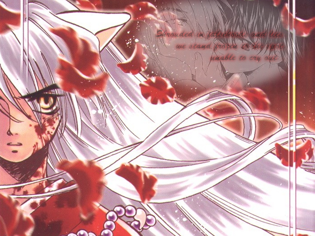 Characters: Inu Yasha, Kagome Series: Inu Yasha Comments: Another semi-BlueKnux inspired paper. We were talking about how awesome the song "Fukai Mori" is (the 2nd ending song of the Inu Yasha TV series) and I looked up the lyrics translation and that one lyric in the corner hit me as awesome. Both images are from doujinshi covers...since I love doujinshi so much. |
