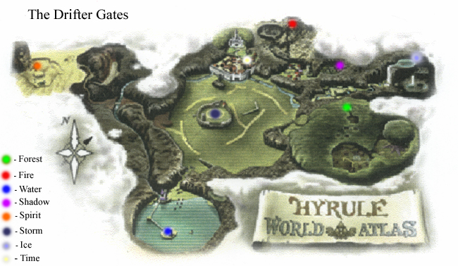 -The Forest Gate (Minuet Gate) - This gate is located in the Lost Woods, erected on the Forest Temple warp dias. The gate is covered in ivy and green leaves, with flowers at its base. -Liquid color - Green. -The Fire Gate (Bolero Gate) - This gate is located in Death Mountain Crater, erected on the Fire Temple warp dias. The gate is constantly rimmed with flame, with brimstone and lava pools at its base. -Liquid color - Red. -The Water Gate (Serenade Gate) - This gate is located in Lake Hylia, erected on the Water Temple warp dias. The gate seems to be made of fluid water, that is in constant motion around the circular shape of the gate, but never loses a single drop of water. There are clear water pools at its base. -Liquid color - Blue. -The Shadow Gate (Nocturne Gate) - This gate is located in the Graveyard (behind Kakariko Village), erected on the Shadow Temple warp dias. The gate is made of black stone and is covered in purple thorns, with a thick blanket of fog surrounding its base. -Liquid color - Dark Purple. -The Spirit Gate (Requiem Gate) - This gate is located beyond the Haunted Wasteland near the Desert Colossus, erected on the Spirit Temple warp dias. The gate is made of sandstone, and has an ancient, cracked appearance. There are small swirling columns of sand that spin about its base on ocassion. -Liquid color - Gold -The Time Gate - (I would ask that no characters come from this gate. This may be the gate I bring the story's main villian in through.) This gate is located within the still-standing Temple of Time, erected on its warp gate. The gate is made of gold and silver, radiating a soothing light and surrounded by silk floor coverings at its base. It is said that this gate leads to the Sacred Realm, but no one can seem to figure out how to activate it. -Liquid color - White. -The Storm Gate - This gate is located upon the ruins of Lon Lon Ranch in the middle of Hyrule Field, and is the fist gate to not have been erected on a warp dias. The gate is made of a stormy blue crystal, constantly crackling with electric energy, with a thick layer of moist fog at its base. It is common for random thunderstorms to erupt over the gate, sending lightning into the sky and thunder rumbling across Hyrule Field. -Liquid color - Stormy gray-blue. -The Ice Gate - This gate is located deep within the Ice Cavern, and is the second gate to not have been erected on a warp dias. The gate is made of ice (what else?), constantly crackling as if about to break apart from its own sheer cold. A thick blanket of snow lay at its base, and it is common for snow to fall at any time. Temperatures are known to drop quite suddenly, and the winds which surround the gate are icy. -Liquid color - Icy blue. -The Swamp Gate - This gate is located deep within the Nameless Swamp, erected on the never-before discovered Swamp Temple warp dias. The gate is made of gray stone that is entangled in woody vines. These vines grow small dark green buds which constantly emit a noxious fog. A mirky bog surrounds its base, and it is common for snakes and other swamp creatures to call the vines of the gate home. Conditions are very humid in this area, and a semi-poisonous cloud always seems to hang in the air. Strong anti-poison charms are needed to traverse the great swamp. -Liquid color - Yellowish green. -A Drifter's world does not always determine which gate he or she enters through. The Drifter's magickal/elemental powers could also play a role, or the Drifter's personality traits. For example, those with fiery personalities, or those quick to temper, might come through the Fire Gate. Those who can manipulate water might come through the Water Gate. Everyone is brought to Hyrule for a different reason, it is up to them to discover why. |