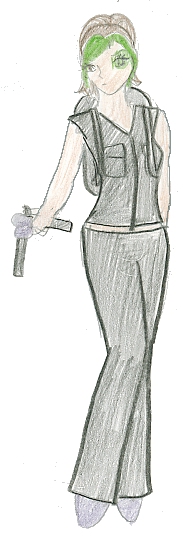 Physical Description: Plumb is 19, she is about 5’5”, she is strongly built and looks like she could beat you’re a$$ any day. Normally she’ll wear some kind of turtleneck sleeveless top with some capries or some booty hugger jeans with tennis shoes. Oh her hair is black but she has like two sections in the front and its pear green. Her hair is usually up in a pony tail that falls to the nape of her neck but she leaves the green sections out.