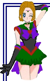 Fuku Apperance: Okay it's a super Senshi fuku. The bodice is black; Her color is green and has dark green flames near the broach going up. The arm cuffs by her color are different the two near the color are purple; the two near the skin are red. Her gloves are black and the armbands are three different colors, the one touching the glove are red, the middle one is purple and the one touching the skin is green. Her broach is red and the two bows are purple. The necklace is green with a yellow star. The weird thing before her skirt is red and the actual skirt is green with dark green flames on the bottom. Her boots are more like army boots and they are black with green laces.