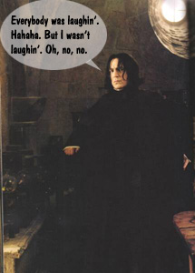 Narrator: ::News of the curses that Snape had stumbled into had spread like wildfire through Hogwarts over the past four hours, the students of his two morning classes had gladly told and retold the story of "The Lord of the Dance" and "I am Draco Malfoy's mother" to anyone willing, or even unwilling to listen, though there were very few students and even teachers that weren't begging to hear the story again and again. By this time, the stories had evolved into stories of Snape dancing and singing while dressed in a pink tutu and giving birth to Malfoy right there on the floor of his class room, and even now the entire Great Hall was more filled with sounds of laughter and gossip than eating::