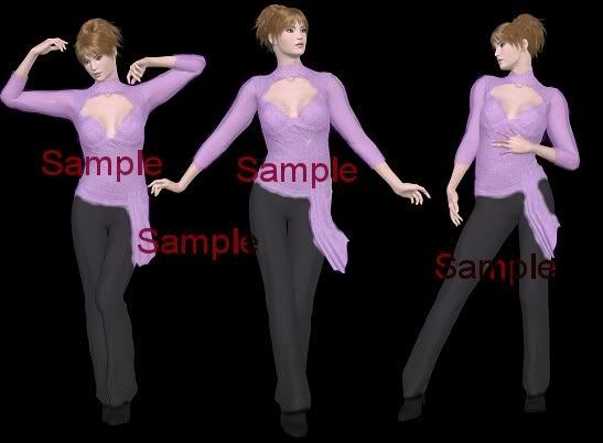 Basic Outfit: This is her usual outfit. The top is medium purple (same color as the text), and the bottom is black leather. Color modified to show exactly or closer to what it looks like.