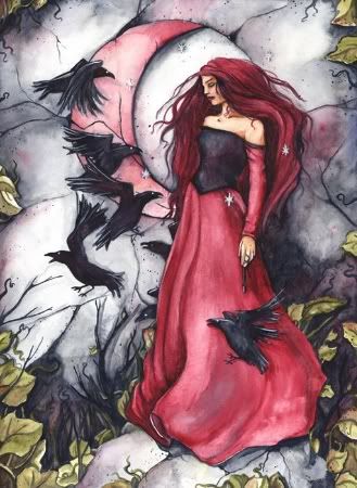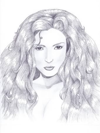 Description: With a farely sun tanned skin tone, she is the perfect depiction of a bronze beauty. With sweeping waves of crimson locks that trail down her back, she gazes about with dark orbs of lilac. Her full figured body is clad in a long loose sleeved, shoulder bearing top, over that is a dark purple leather bodice.Her skirt it a bit gaudy (and may be changed soon), being dark purple with gold stars and moons (just a pic dif from the pic on her outfit page). Up her sleeve, she usual hides her a shawl, color changing red-purple with gold celestial symbols on it, she uses it for dancing and sometimes to hold back her hair. Around her waste are two more sashes. The first is black, plain for the most part save for the frilled edges on which are many gold colored charms. The second lays intop of the first. It is sheer blue with layers of beaded studs sewn into it, from which many colorful beads hang, below that "coins" are located..dangling from the end. Example here