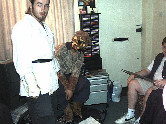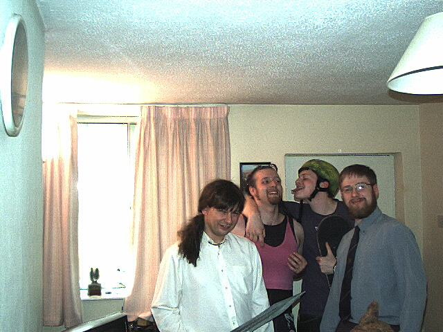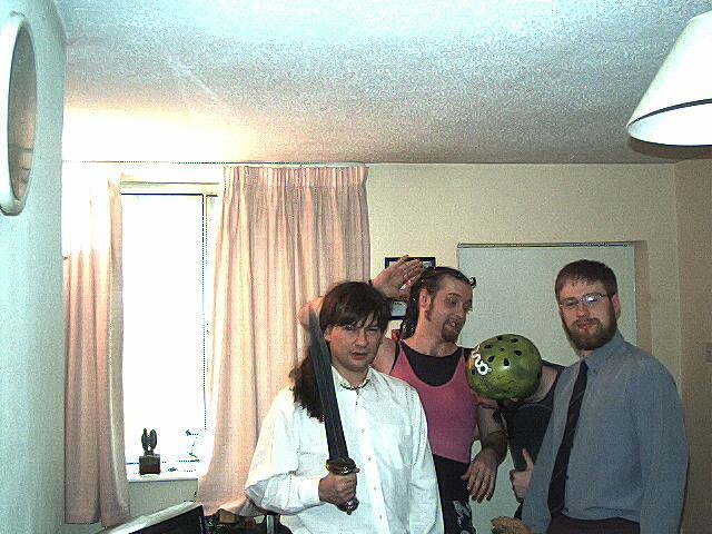 THE OLD CHRONICLE Recap: The New Bane - the Haephodant, has been defeated at the source and the queen no longer able to produce the Royal Jelly which kept the Bane's loyal is no longer in production. Pentex has to now deal with the remaining Haephodants to protect their own ventures. The victory celebration brought the return of Moves-with-Moon. He was considered lost on the umbral surface of Mars before the meltdown occurred and unable to get into the physical (no space suit) but had mananged to escape via spirit bridge to the umbral hollow of the space ship. There he rode the 'wave' home and Mammoth made a moon bridge for him when he got close enough to Earth. His appearance in the Victory moot added to the celebration. Wine was drunk, Galliards sung songs and Lupus played in the moon light, until the Dawn of the new days light. The last session of the chronicle was done in fancy dress for a big laugh and here are the results. From left to Right - Apache (Pete) as Lu-Tsu, Raja as Moves-with-Moon, Jamie (costume less as he was a wuss!) Paul as Jean De Grace, Matrix (Richard) as Summer Fairbrook, Caz (John) as Knate Fischer, and Matt as Daemon Wright