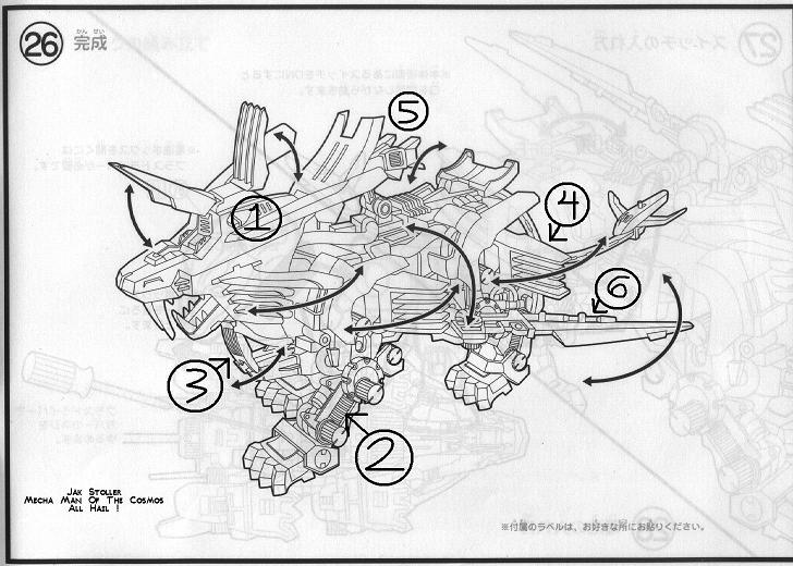 Fixed Armament: Twin repeating blaster cannons (15mm barrel diameter, mounted along blades) estimated at 5.5Mw ; Dual Impact Cannon (30mm barrel width) roughly 10Mw power consumption for both; Hardened alloy strike claws; Hardened alloy teeth (» 2 meters long); Laser Blades (» 8.8 meters long) estimated at 200Mw power consumption each, blades must reach a temperature of atleast 1427ºC in order to cut through medium grade steal (typical grade for all mass production Zoids), the blades electrons vibrate at 20GHz when active, thus countering the charged particle cannon (the cpc’s ionized particles vibrate at the same frequency, thus they interact with each other).