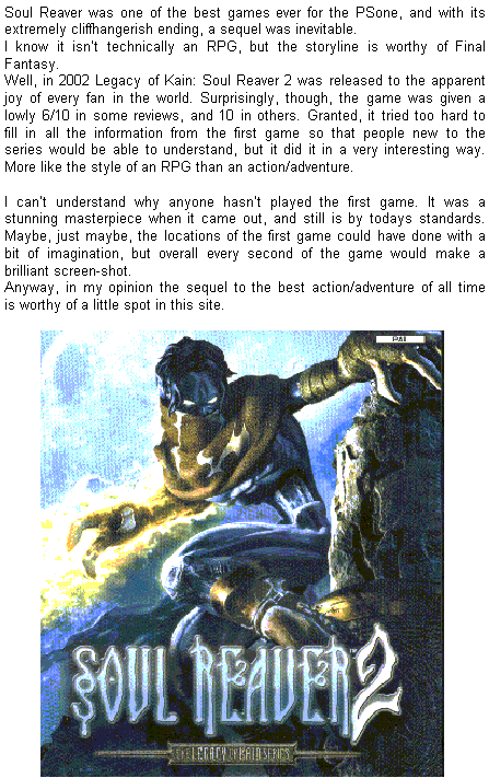 Raziel emerges from the time portal and returns to different eras of Nosgoth's past in his relentless persuit of Kain. Confronting the shadows of an unremembered past, he discovers a web of destiny stretching far into Nosgoth's dim, unrecorded history. As his destiny comes full circle, Raziel finds his personal vendetta transformed into a hero's journey, with the fate of Nosgoth hanging in the balance.