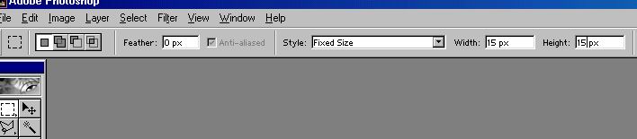 Then go to the ractangle marquee tool and choose fixed size like I have above. Make the Width and Height 15 px. This is how big the grid will be so if you want it bigger or smaller change the px here (but remember for it to look good always make it have the same height and width). Make sure Feather is set at 0 px.