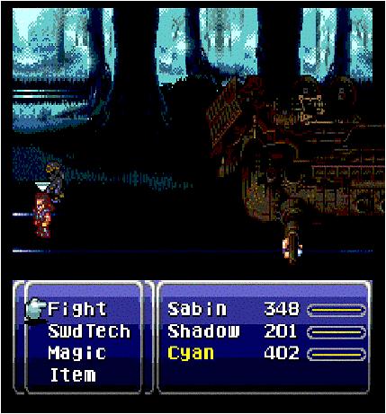 Cyan is a samurai, which of course means he is a great fighter. He looks and talks a lot like a midieval knight unfortunately, but this really doesnt take away from him as a character. He uses samurai swords as his weapons, and is your strongest physical fighter for the most part. His special ability is Sword Techs. Dispatch causes him to leap and slash an enemy. Retort causes him to counter attack for major damage when he gets hit. Slash is used to cut an enemy's HP in half. Quadra Slam causes him to attack 4 times on random enemies. Empowerer is kind of like Dragon Sword, draining HP and MP from an enemy. Quadra Slice is a much more powerful version of Quadra Slam. Cleave is an instant kill attack, it causes him to leap off the screen and slice all the enemies, cleaving them in half. Cyan's ultimate weapon is the Sky Render.Celes -