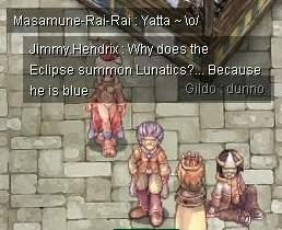 10072004 This bard has done what Strings was unable to do, crack my winning (very corny) Ragnarok joke. I haven't gotten my prize for winning yet, though, client won't patch in my system, darn! This pic was copied shamelessly (heck, Raucous ain't a rogue for nothing ;) ) from the Shadowmaidens Web Board. Props to the guitar legend /no1